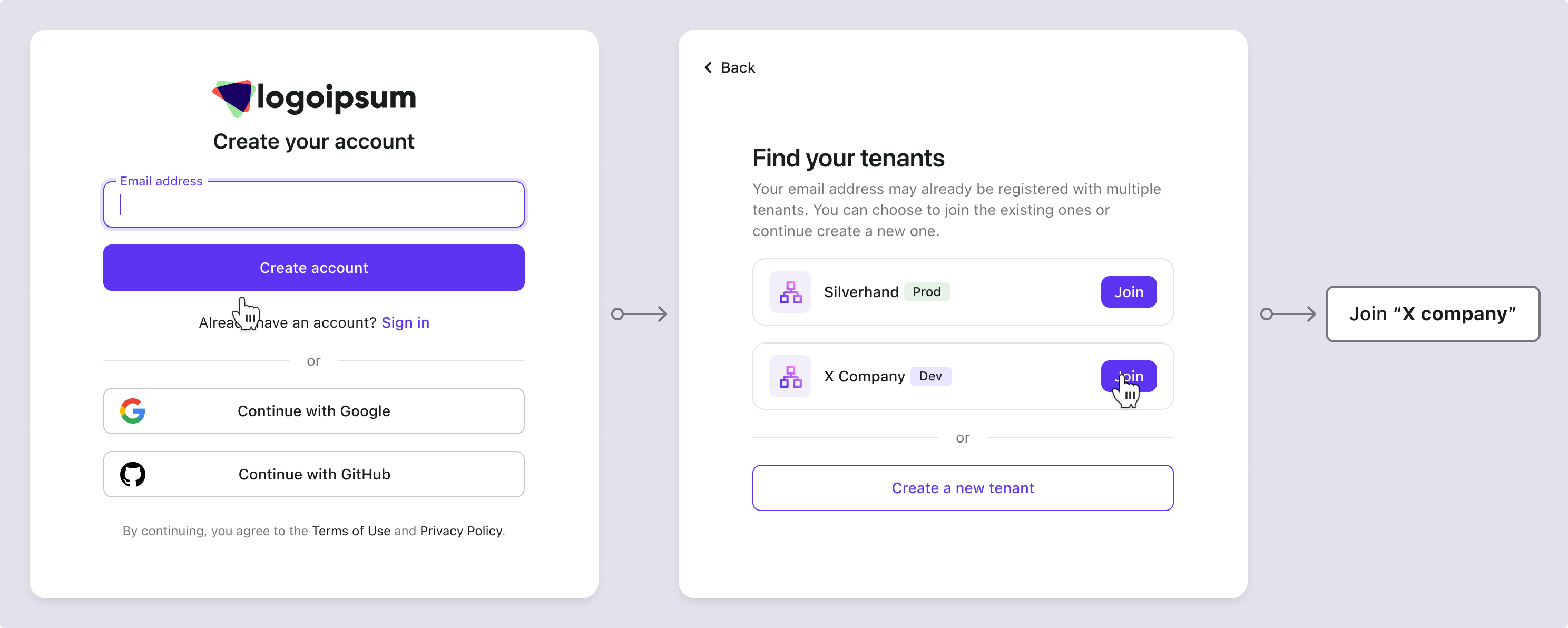 조직 목록과 가입 플로우는 일반적으로 사용자 온보딩 과정에서 나타납니다. 예를 들어, 관리자가 누군가를 워크스페이스에 초대했지만, 사용자가 이메일 초대를 건너뛰고 앱에서 직접 로그인 또는 회원가입을 하는 경우입니다.